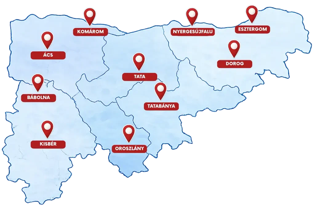 Kizárólag Komárom-Esztergom megyében dolgozunk. Tatabánya, Tata, Esztergom, Komárom és a környező települések tartoznak a szolgáltatási területünkhöz.